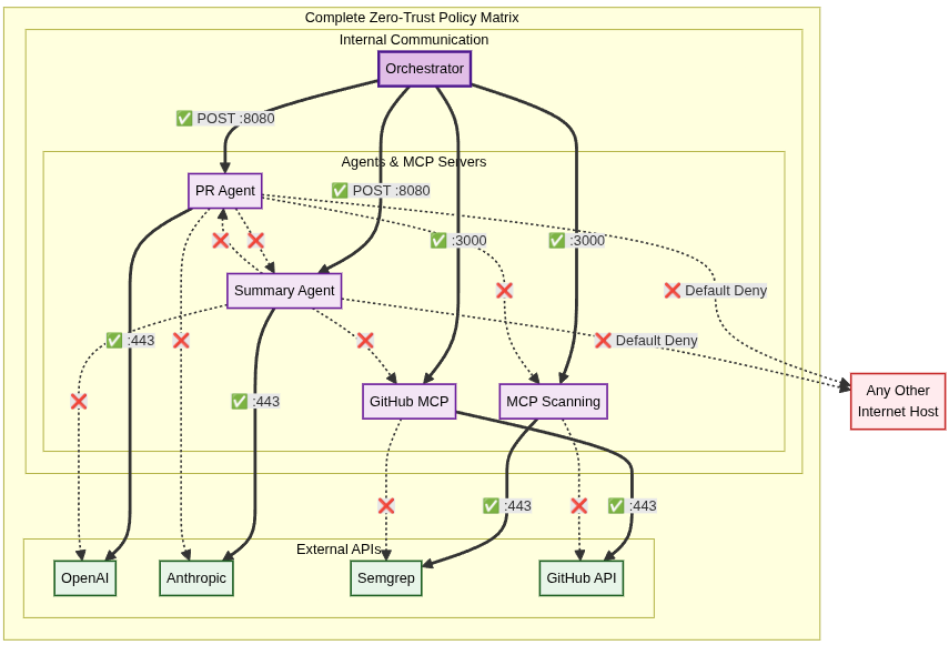 | Orchestrator Agent | GitHub MCP Server | ALLOW | PR comment posting |