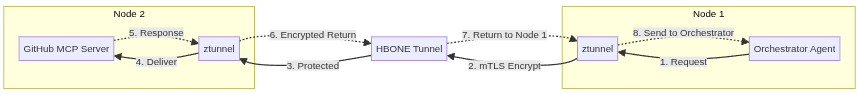 The GitHub API is modeled explicitly inside the mesh, and only the GitHub MCP Server’s SPIFFE identity is authorized to reach it. All outbound enforcement happens at the source node by ztunnel, ensuring no other workload can communicate with GitHub directly.