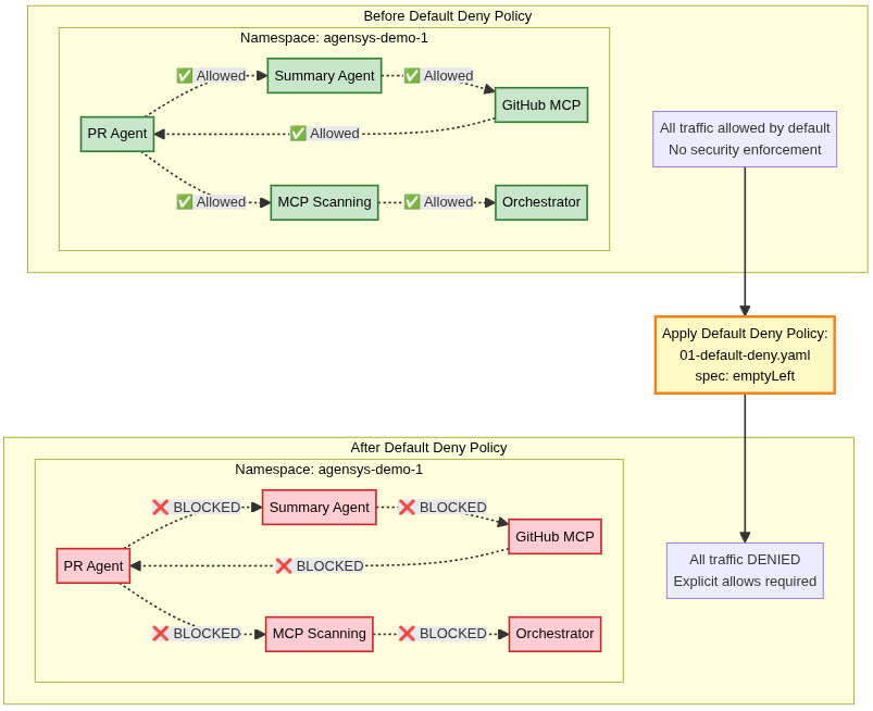01-default-deny.yaml policy establishes the security baseline for the entire agent platform. It places the namespace into a default-deny posture: unless a communication path is explicitly allowed, it does not exist. All inbound connections are evaluated by ztunnel on the destination node and are denied by default. This inverts the network trust model from “everything is reachable” to “nothing is reachable unless permitted.”