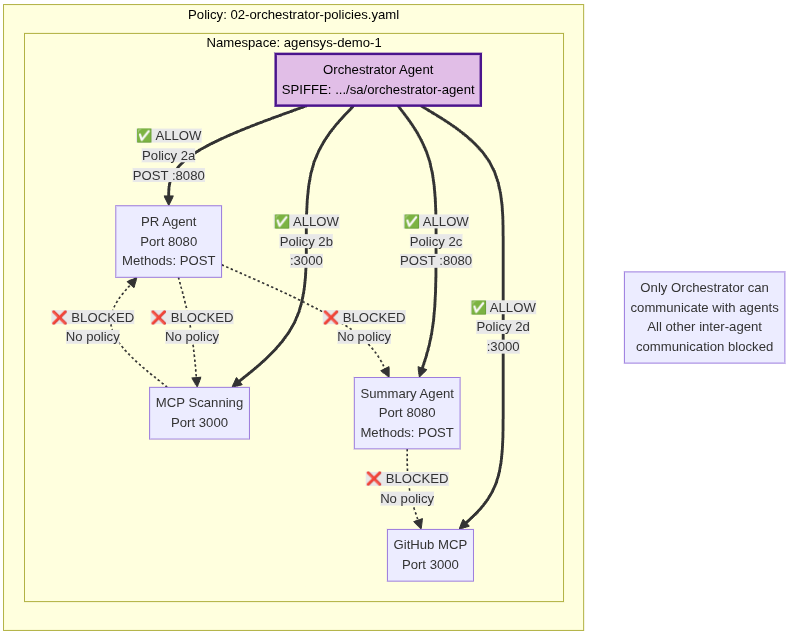 All four destination services accept inbound traffic exclusively from the Orchestrator’s SPIFFE identity. No other agent can trigger reviews, initiate scans, request summaries, or publish results.
