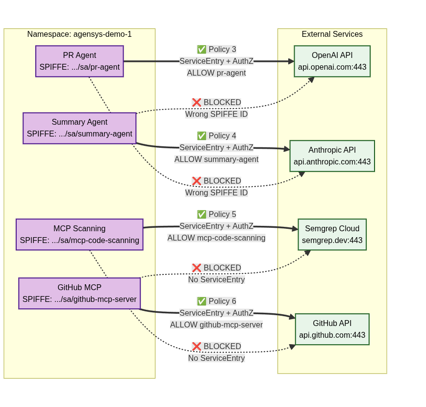 Each agent and MCP service is allowed to reach only its explicitly assigned external dependencies. These egress paths are enforced using a ServiceEntry to model the external service and AuthorizationPolicy to restrict which workload identity may use it.