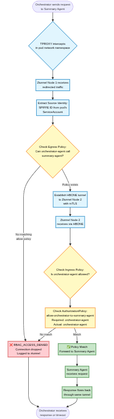 If the request is allowed, ztunnel establishes an encrypted HBONE tunnel to the destination node and forwards the traffic. On arrival, policy is evaluated again before the request is delivered to the Summary Agent. If the request is denied at any point, the connection is dropped and the denial is logged.
