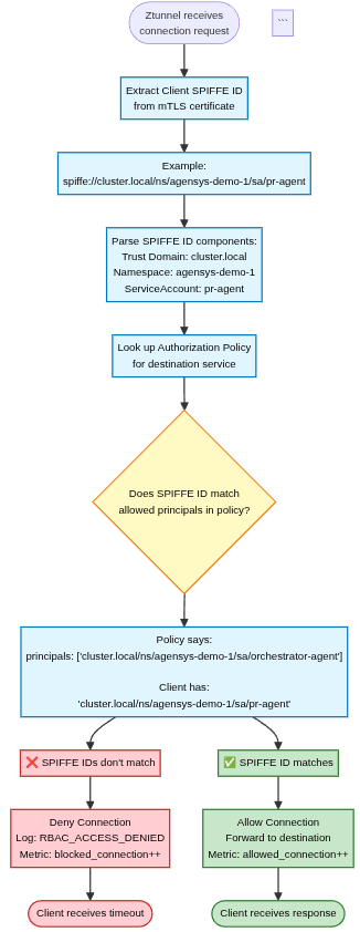 ztunnel extracts the caller’s SPIFFE ID from its mTLS certificate and compares it against the destination’s AuthorizationPolicy. If the identity matches an allowed principal, the connection is permitted. If it does not, the connection is denied.